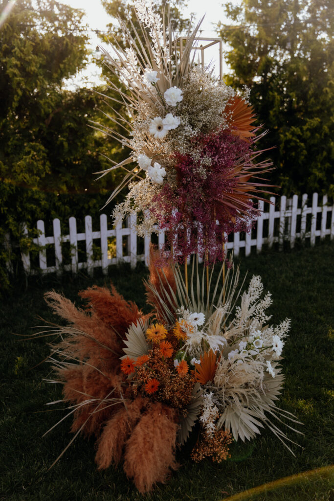 Kolor, kolor, kolor! Gorący sierpień i przepiękna paleta kolorów: fuksja, pomarańcz, biel, beż, i miód. Energia! Nad Para Młodą zawisła chmura z kolorowych wstążeczek, a za Nimi suszone palmy z neonem. Na stołach gości pojawiły się równie kolorowe kompozycje oraz wysokie świece.