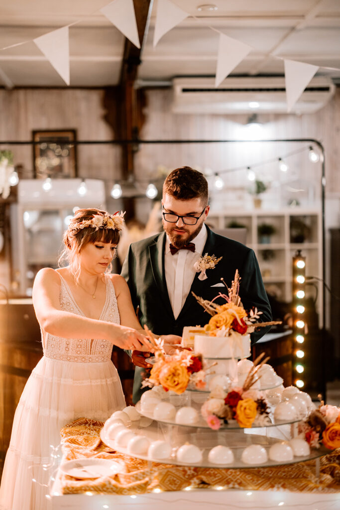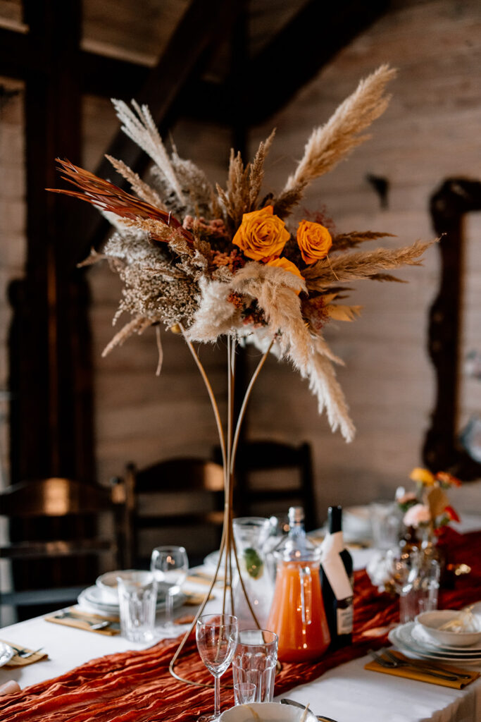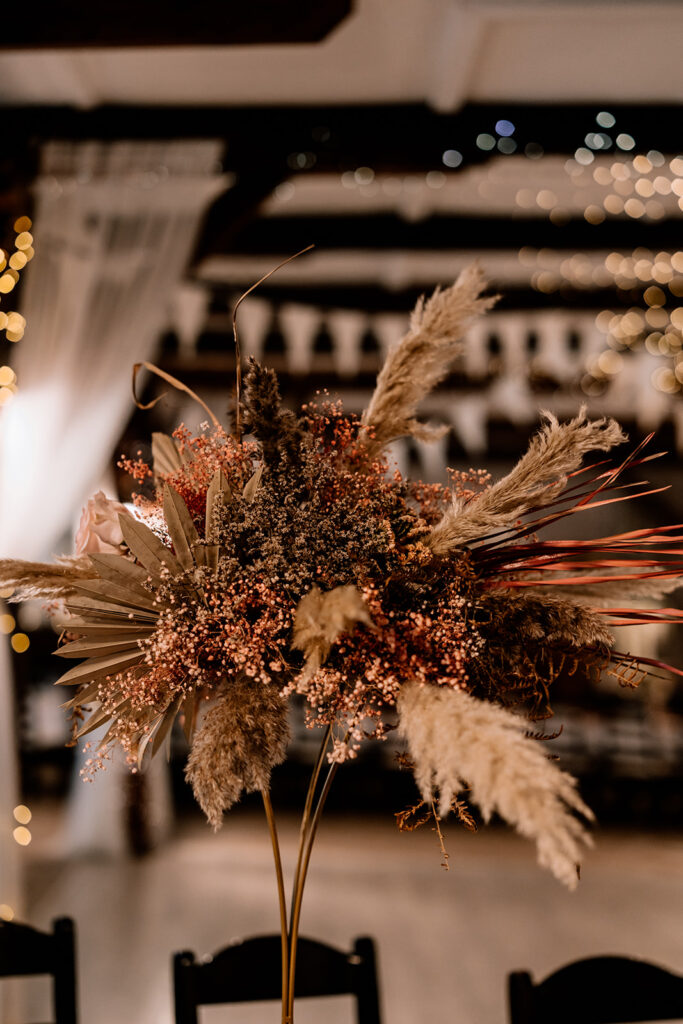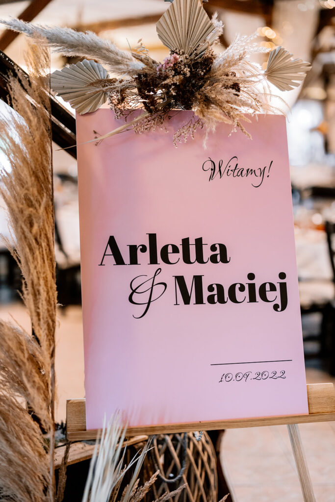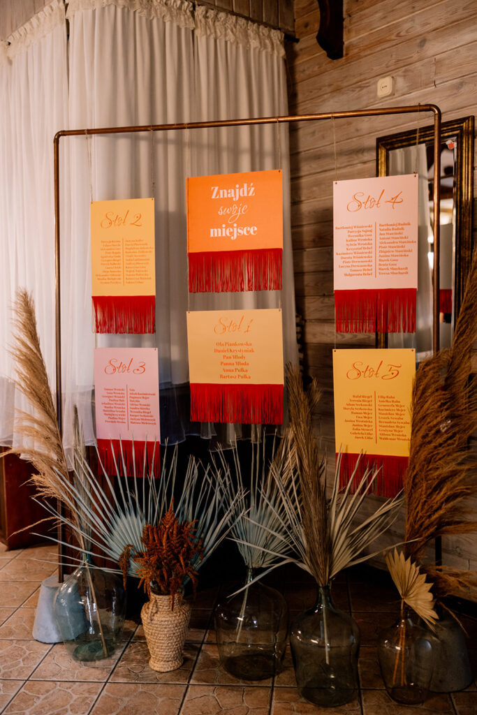 Kolor, kolor, kolor! Początek września i przepiękna paleta kolorów: miodowy i brudy róż, przepleciony terrakotą, odcieniami beżu i bielą. Połączenie nadchodzącej jesieni z końcówką lata. Nad Para Młodą zawisła chmura z suszaków, a za Nimi kolorowe wstążki. Na stołach gości pojawiły się kompozycje na wysokich stojakach.