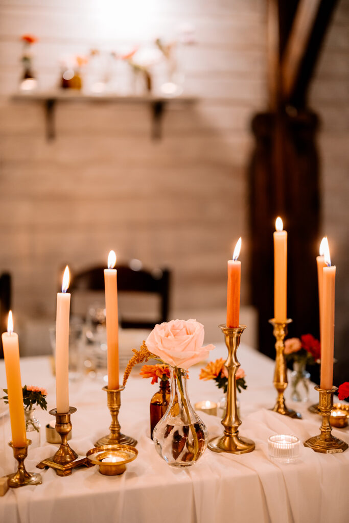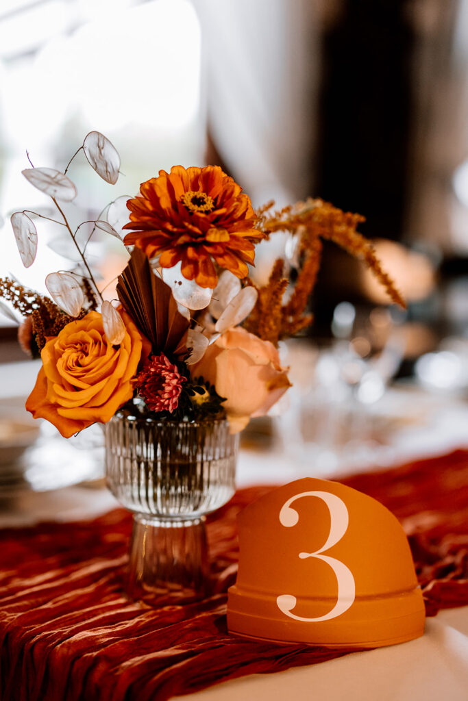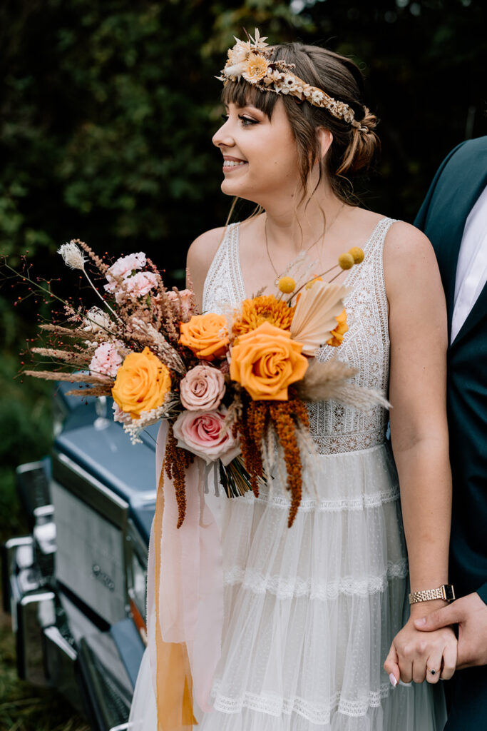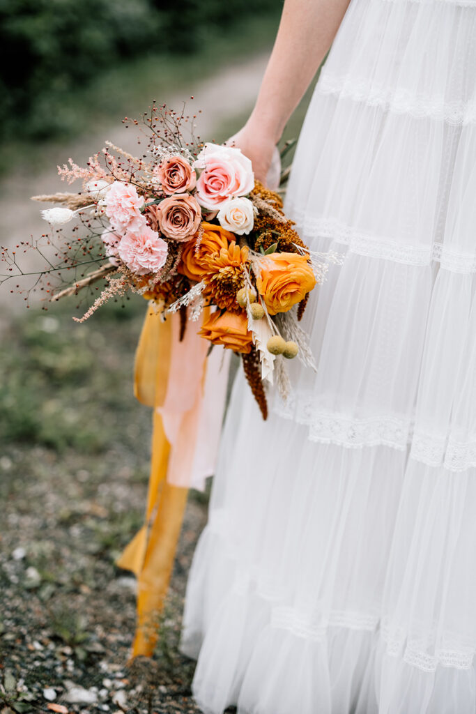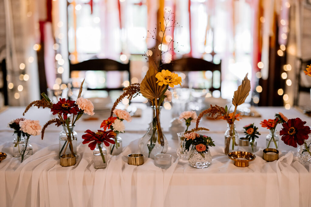 Kolor, kolor, kolor! Początek września i przepiękna paleta kolorów: miodowy i brudy róż, przepleciony terrakotą, odcieniami beżu i bielą. Połączenie nadchodzącej jesieni z końcówką lata. Nad Para Młodą zawisła chmura z suszaków, a za Nimi kolorowe wstążki. Na stołach gości pojawiły się kompozycje na wysokich stojakach.