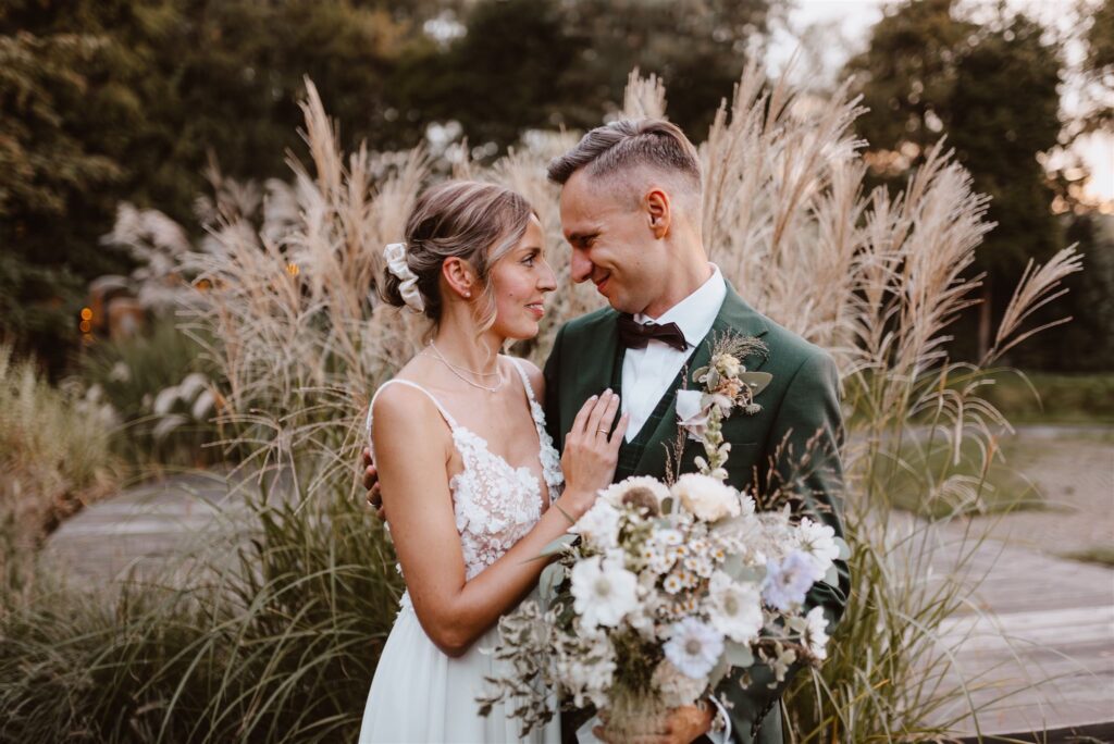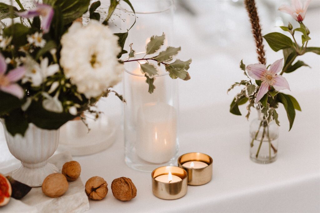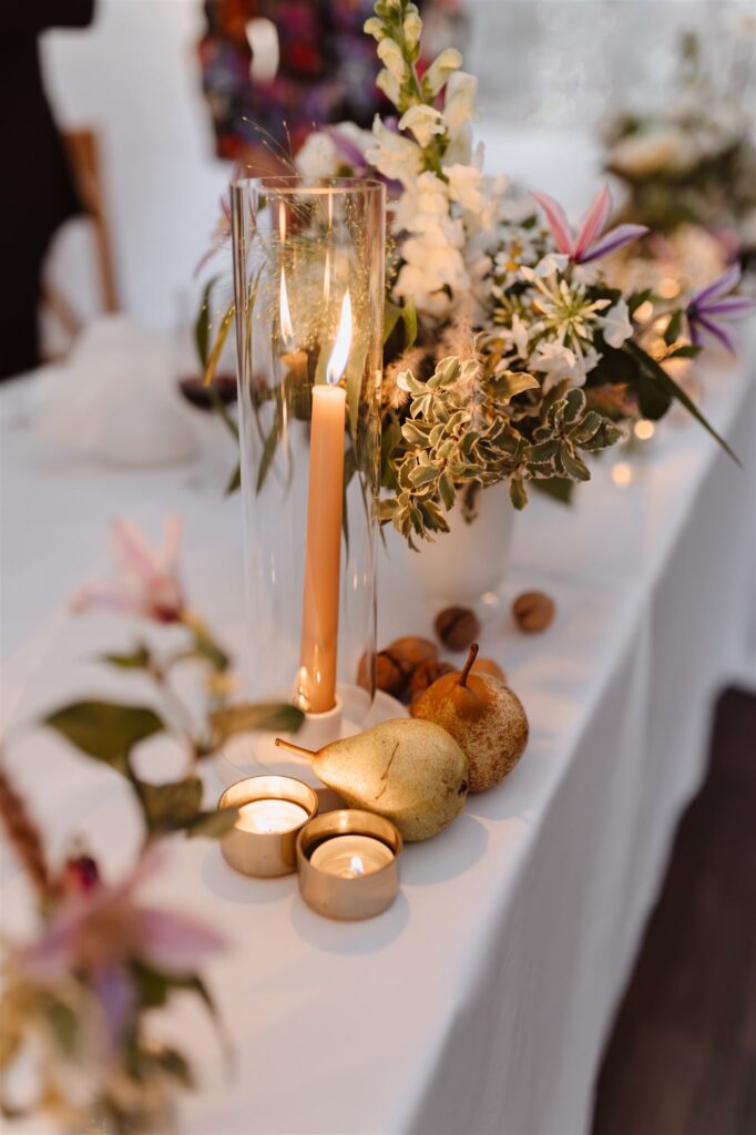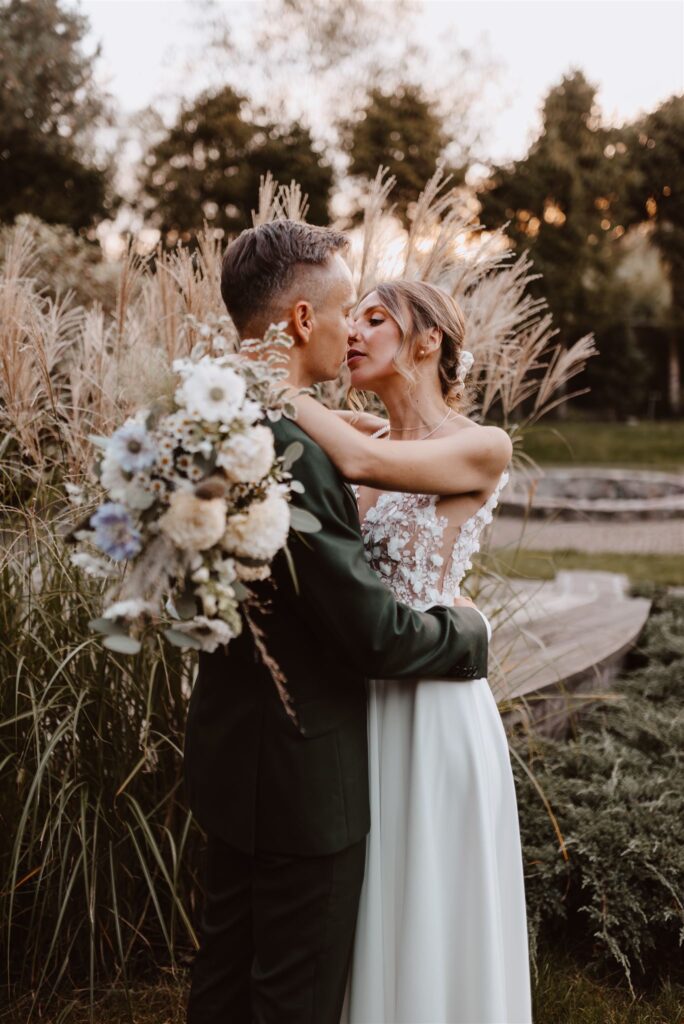To był przepiękny jesienny ślub w Kainówce. Lekkie i zwiewne delikatne kompozycje pełne traw i kwiatów.  Za Parą Młodą zawisła chmurka kwiatów, suszków i traw, dodając uroku całej aranżacji. Na każdym ze stołów pojawiły się kompozycje w naczyniach oraz buteleczki vintage z kwiatami.