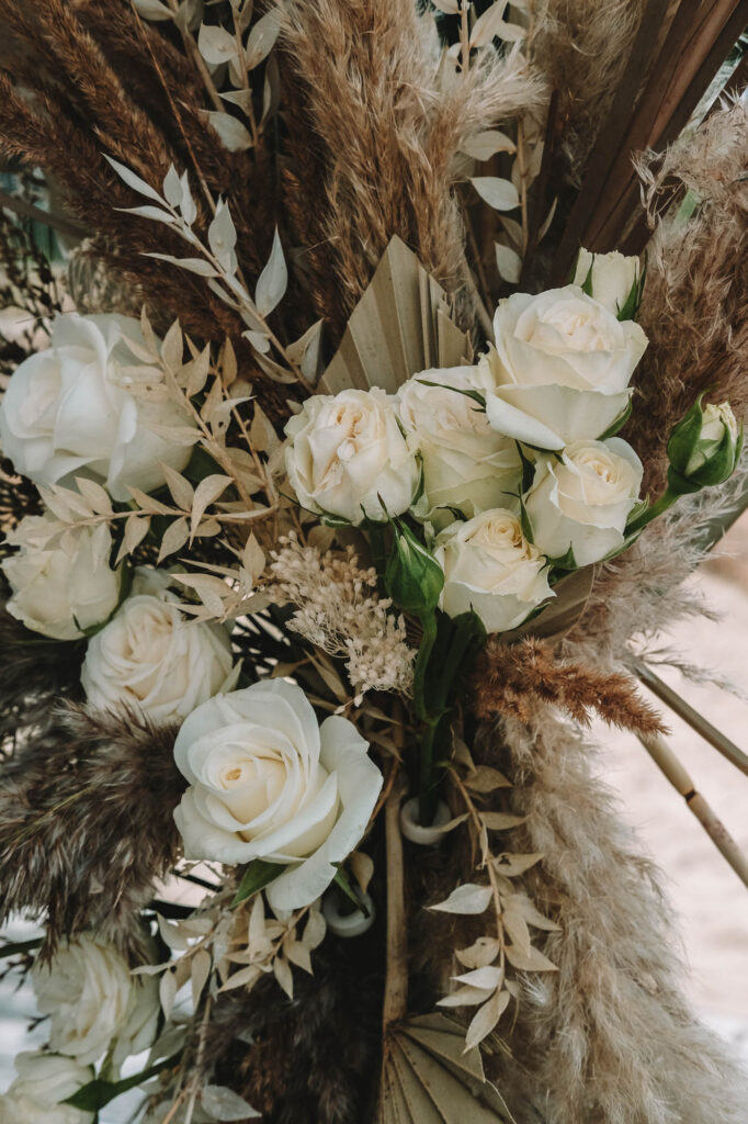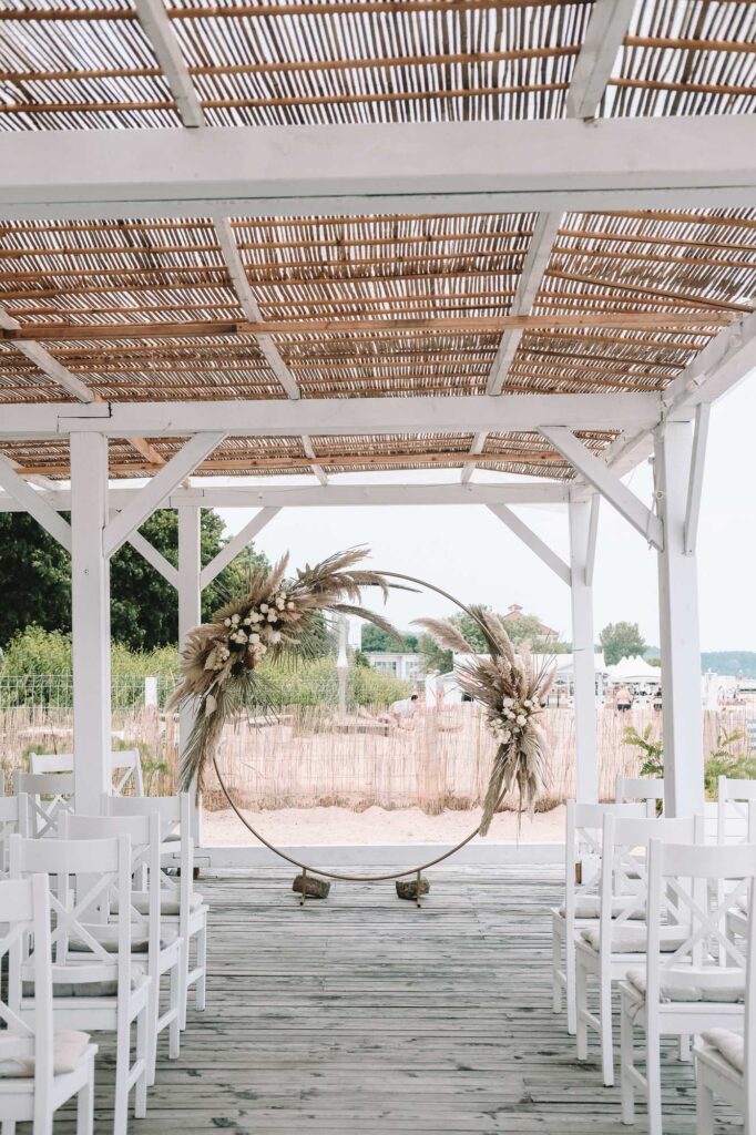 Upalny lipcowy weekend, plaża, Sopot i bramka ślubna dla Magdaleny i Janisa na tarasie White Marlin. Połączenie idealne. Delikatne suszki, trawa pampasowa i białe róże.